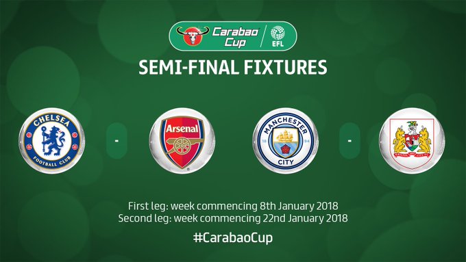 Pengundian semifinal dilakukan pada Rabu (20/12/2017) malam atau Kamis dini hari WIB. Undian dilakukan setelah laga Bristol City vs Manchester United berakhir.